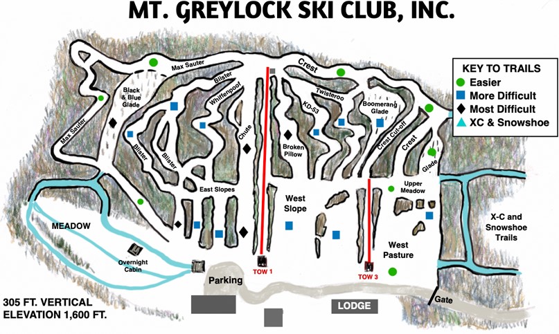Our trails face north, so the map shown above is oriented with south at the top. For a topographical map showing the Mount Greylock Ski Club and the Stoney Ledge Ski Trail, please click here. Our ski area has an elevation difference of 305 feet.